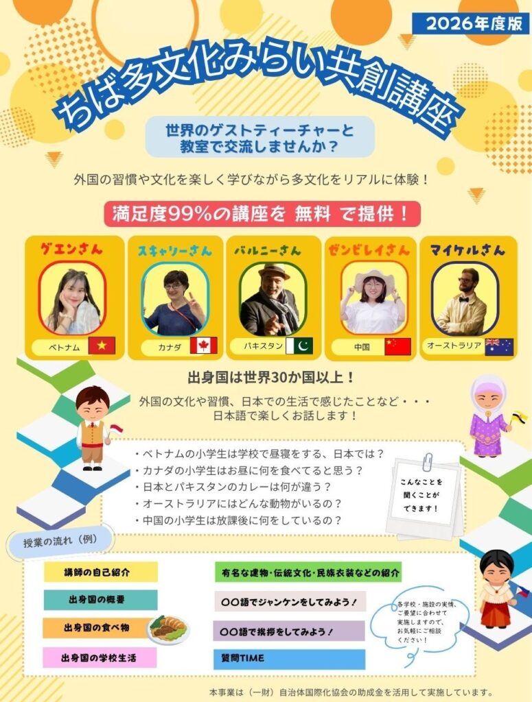 千葉県国際交流センターでは、県内の小学校、中学校、医療機関・福祉施設に入所する子どもたち向けに、ちば多文化みらい共創講座(通称:ちば出前講座)を実施しています。在住外国人講師から出身国の文化や習慣についてのお話を聞き、多様なバックグラウンドを持つ人々と交流する楽しいワークショップ型の講座です。