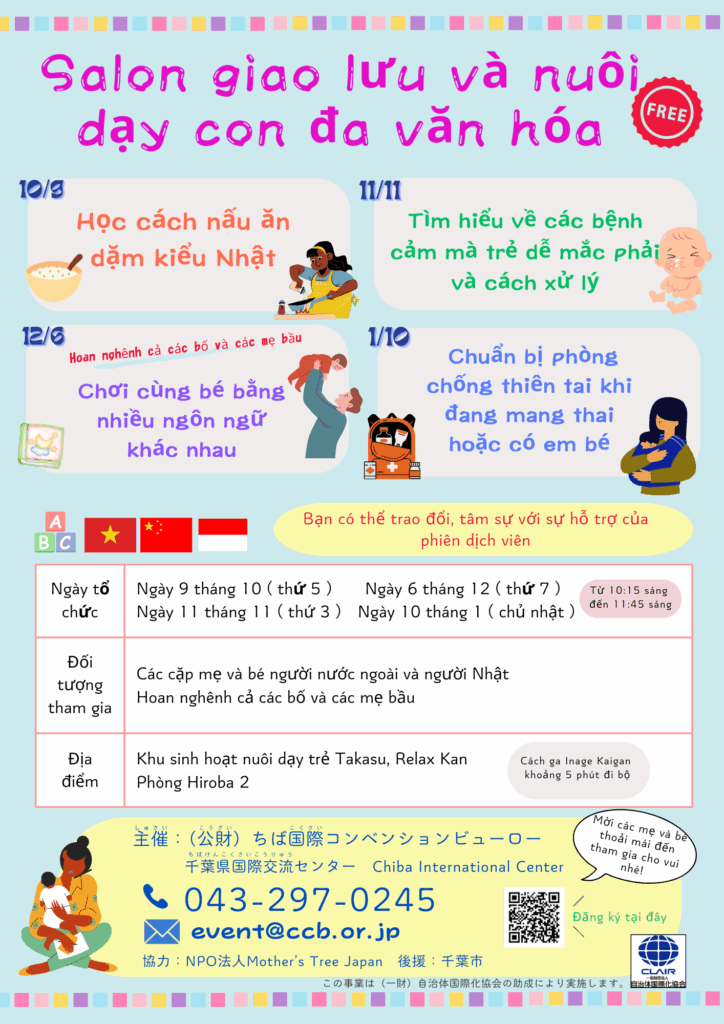 Nội dung:Hãy thử làm đồ ăn dặm của Nhật Bản!/Tìm hiểu về ăn dặm ở các nước khác(10/9)・Tìm hiểu về các bệnh cảm mà trẻ dễ mắc phải và cách xử lý(11/11)・Chơi cùng bé bằng nhiều ngôn ngữ khác nhau(12/6)・Chuẩn bị phòng chống thiên tai khi đang mang thai hoặc có em bé(1/10)