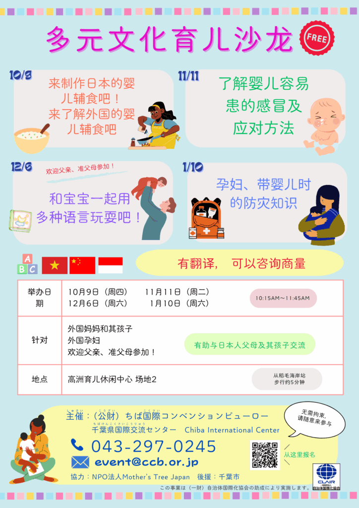 内容:来制作日本的婴儿辅食吧!/来了解外国的婴儿辅食吧(10/9)・了解婴儿容易患的感冒及应对方法(11/11)・和宝宝一起用多种语言玩耍吧!(12/6)・孕妇、带婴儿时的防灾知识(1/10)