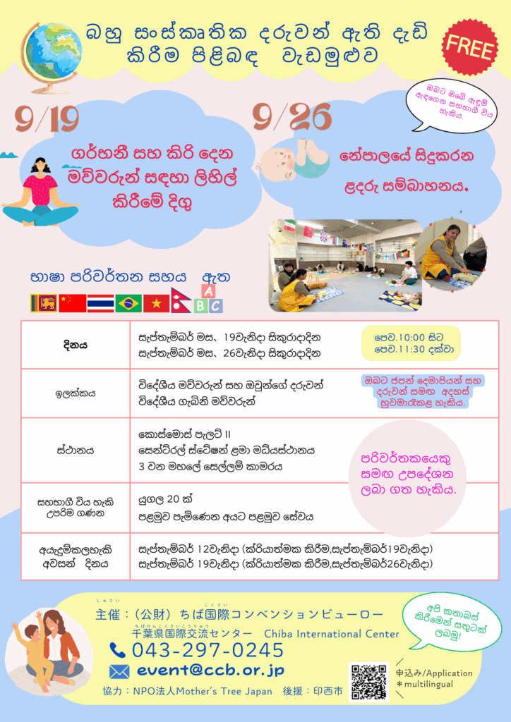 අන්තර්ගතය:ගර්භනී සහ කිරි දෙන මව්වරුන් සඳහා ලිහිල් කිරීමේ දිගු කිරීමේ ව්යායාම(9/19)・නේපාලයේ සිදුකරන ළදරු සම්බාහනය.(9/26)අපි කතාබස් කිරීමෙන් සතුටක් ලබමු!